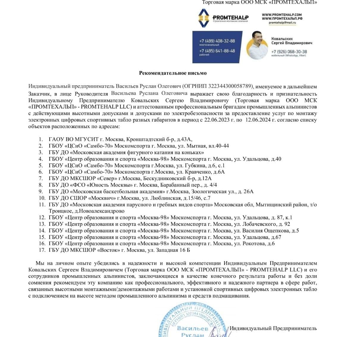 Рекомендация за предоставленные услуги по монтажу электронных цифровых табло и медиа экранов на объектах "МОСКОМСПОРТА, все работы осуществлялись на высоте методом промышленного альпинизма и средств подмащивания - выполнено ИП Ковальских Сергеем Владимировичем.